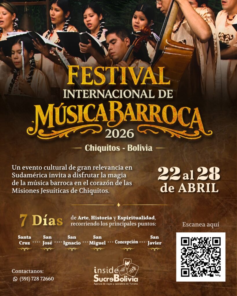 Del 22 al 28 de abril de 2026, músicos, coros y ensambles de distintos países interpretarán obras maestras del repertorio barroco en un recorrido único por las joyas misionales del oriente boliviano: desde Santa Cruz de la Sierra hasta las históricas reducciones de San José de Chiquitos, San Ignacio de Velasco, San Miguel de Velasco, Concepción (Santa Cruz) y San Javier (Santa Cruz).